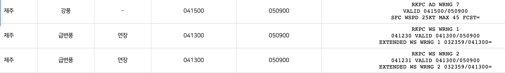 제주공항의 항공 기상 예보를 통해 알아보겠습니다.