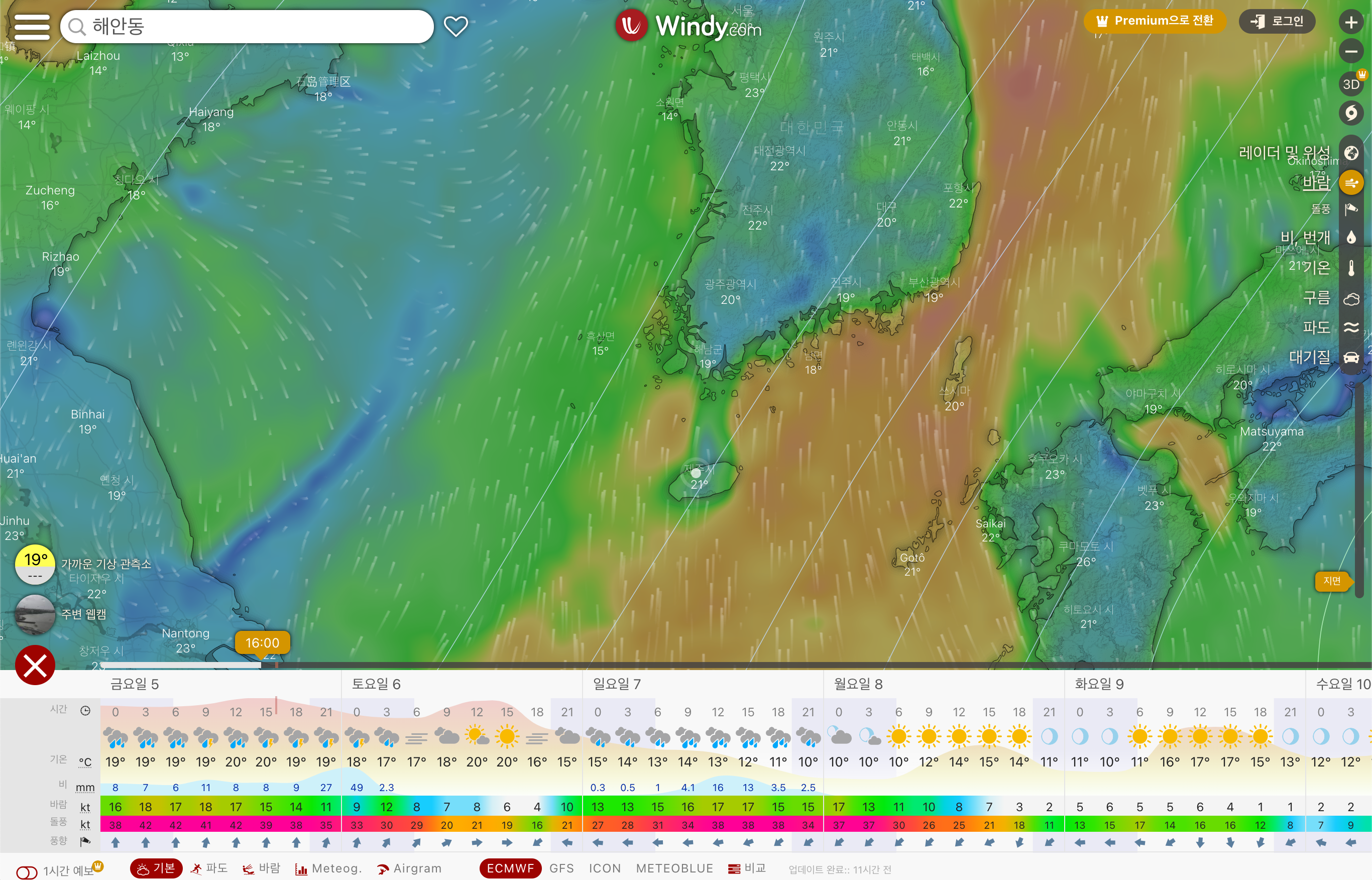 "윈디"라고 불리우는 서비스를 이용하는 것입니다. 윈디 사이트에서는 약 3시간 간격으로 원하는 지점의 기온, 바람 세기, 바람 방향, 강수량, 구름의 양을 확인할 수 있습니다.